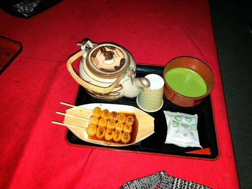 お茶屋さんで暖かいお抹茶とみたらし団子。