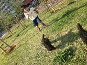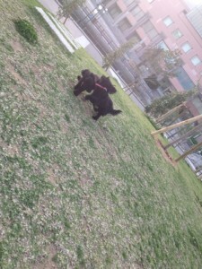 芝生を追いかけ合うのがブームの輝星と2ワンコ