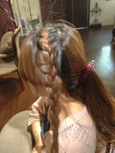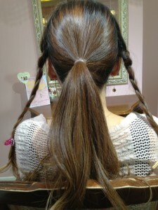 一つにくくったゴムの上に、編みこんでいた横の毛を