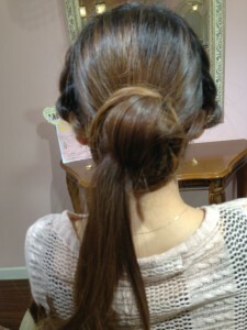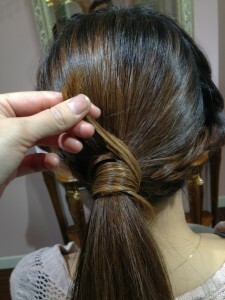 編みこみを両側巻きつけれたら、後ろのくくった毛を半分に分けて