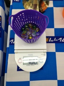 電気屋へ行くと、おはじきを囲んで入れてぴったり100gにするというゲームをしていたので